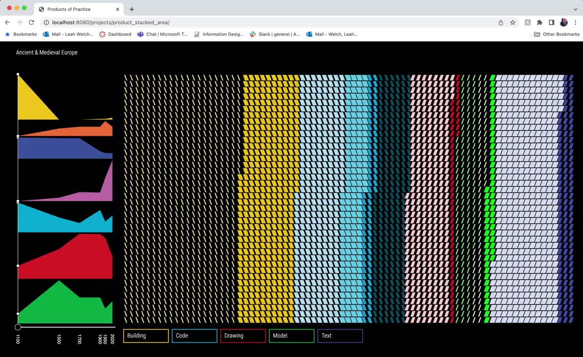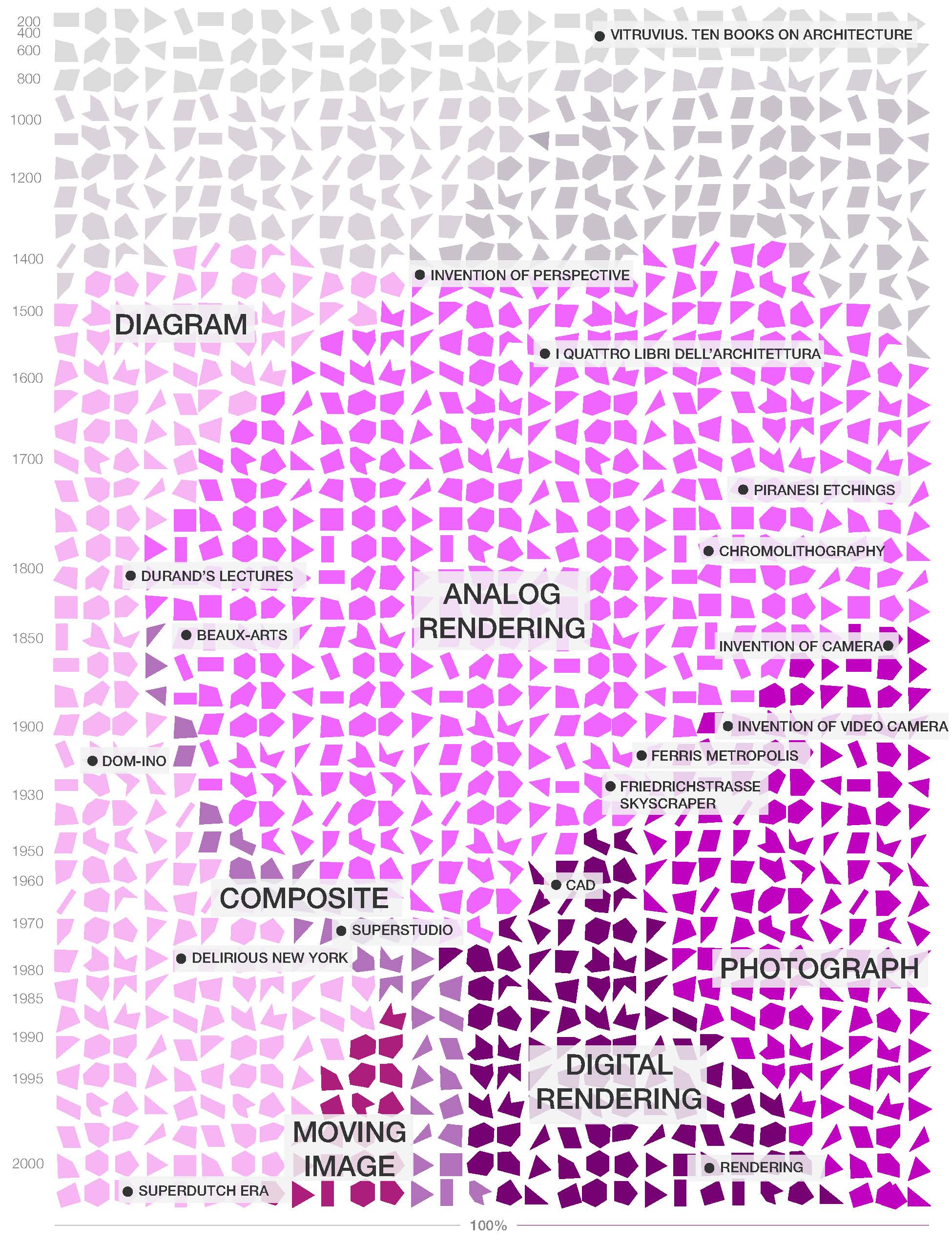 The y-axis of each zero-sum fingerprint visualization tracks time in chronological order while the x-axis hypothesizes the share of influence and dominance of a particular sub-product within the fixed total of the product. For example, text-based instrumentation evolves from the form of the treatise to a more diverse range of monographs, manifestos, and discursive monologues as the discipline and profession mature over time.