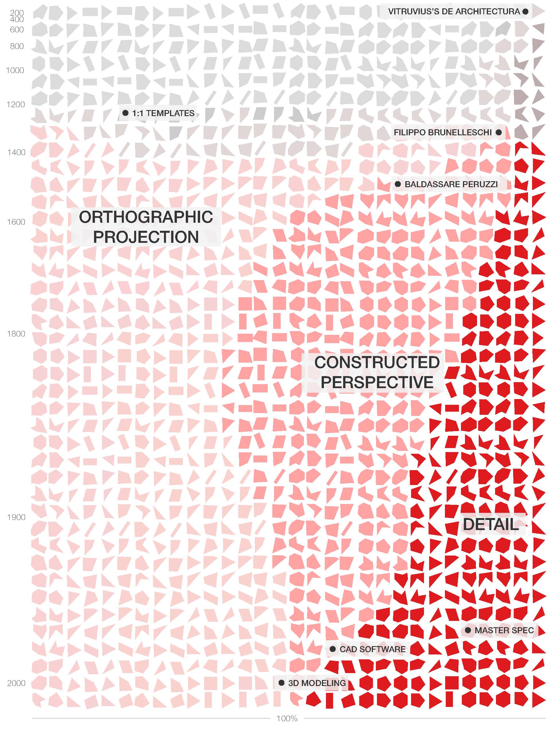 In subsequent years of the course, students tested two complimentary modes of information collection: a single visualization of the “body” of practice and individual “fingerprints” of each product. This addition of the fingerprint visualization helped students to address a single mode of architectural instrumentation by defining and refining its sub-products as they wax and wane in response to inflection points such as the invention of computer aided design, significant shifts in regulation, or threshold cultural moments.